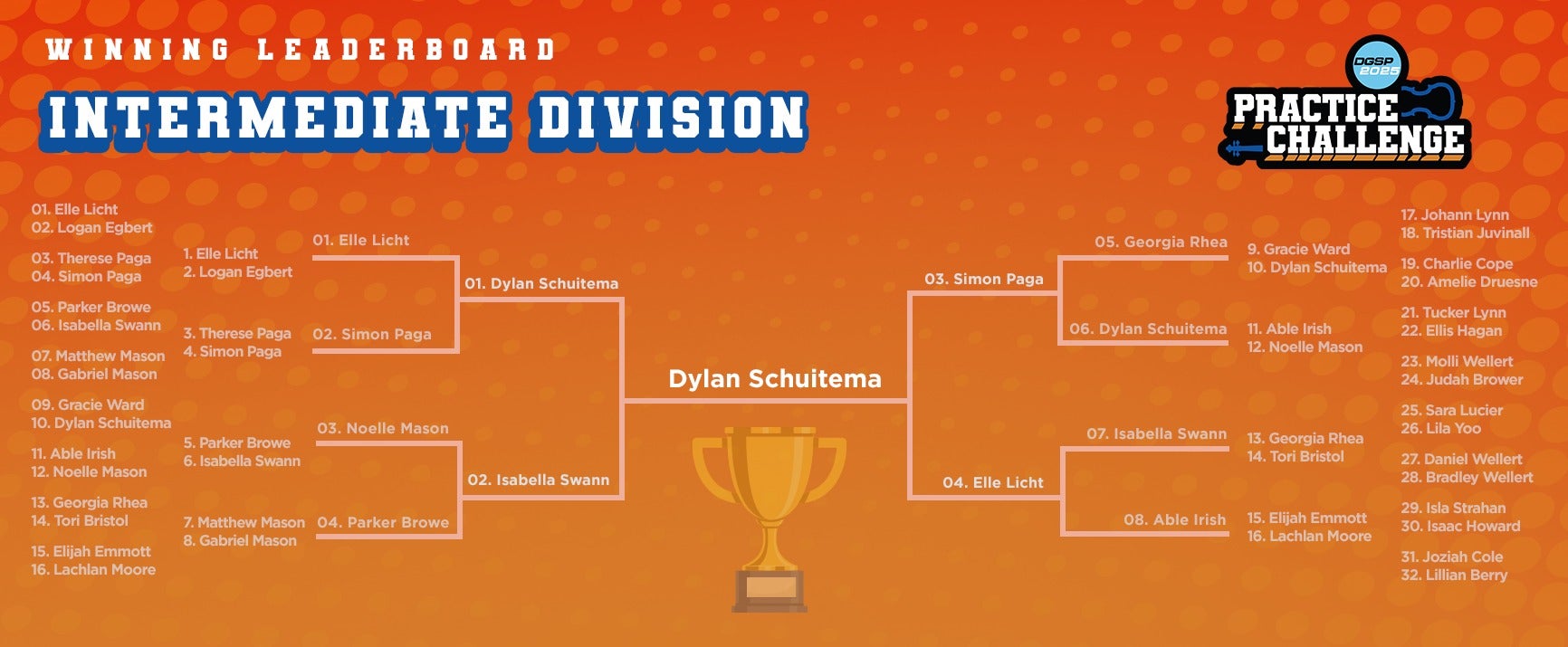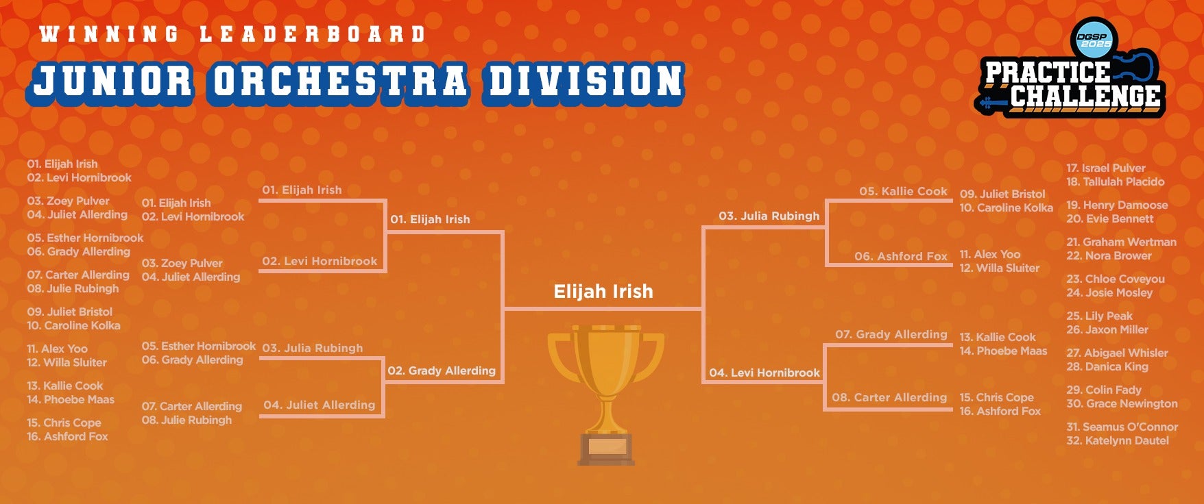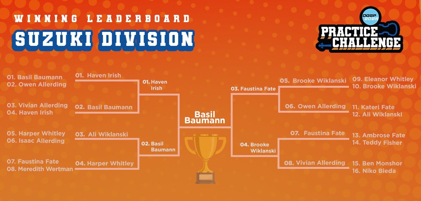- Parents are asked to submit their child’s practice log by 6:00PM on Saturday, February 8 and 15 by either text or email (616.828.8321 or dreimer@greatlakescfa.org). Leader boards will be posted on DGSP Facebook page and website so that you can check to see if your student is among the leaders in their division. The first round concludes at 9:00PM on Friday, February 21, so all practice log’s should be texted or emailed at that time (paper copies should be turned in at the student’s next class or lesson).